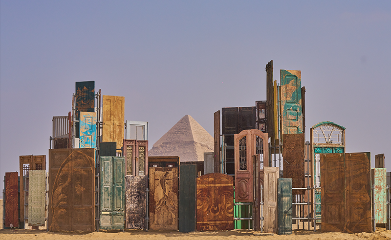 Doors are the architecture of intimacy. Collected from the streets of Cairo, these gateways hold traces of memory and gesture—they have witnessed meetings and farewells, moments of closeness, shelter, and secrecy. In Doors of Cairo, Portuguese artist Alexandre Farto, known as Vhils, reassembles these reclaimed fragments into a temporary monument, transforming everyday objects into vessels of collective history. Set against the desert landscape, the doors shed their original purpose to become thresholds, portals between past and present. They stand as symbols of human connection and layered histories, the contemporary door leading right into a glorious past.