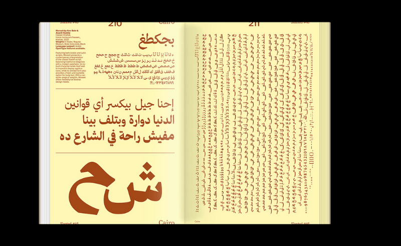 Together, type designers Amr Bakr and Alaa El Hadidy — the recent winner of the Cairo Design Award 2025 — created ‘Moreeh’, a two-page text-based spread in Slanted. The artwork brings Arabic and Latin script together at deliberately disorienting angles, exploring how traditional Naskh can be pushed and contemporised through form and composition.