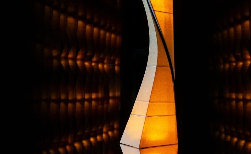The collaborative LA-baed studio of Serge Beaulieu and Yelena Filipchuk presents a golden, honeycomb-vaulted structure that resembles a faceted cave. By day, its filigreed patterns cast ever-changing shadows. By night, light animates the structure from within, making this geometric marvel feel ephemeral and alive. It’s a place to walk through, sit inside, and simply be enveloped.