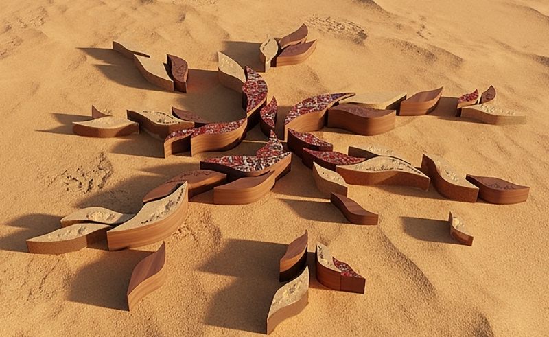 This radical installation guides visitors through a journey across time, material, and memory. The structure references archaeological findings spanning the Palaeolithic to Late Pre-Islamic periods, allowing movement through layers of history. Each step through the installation echoes excavation and discovery, offering a contemplative experience of the desert as both gallery and chronicle.