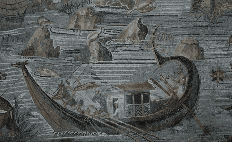 Detail from the Nile mosaic of Palestrina depicting boats much smaller than the pleasure barge discovered off the coast of Alexandria.