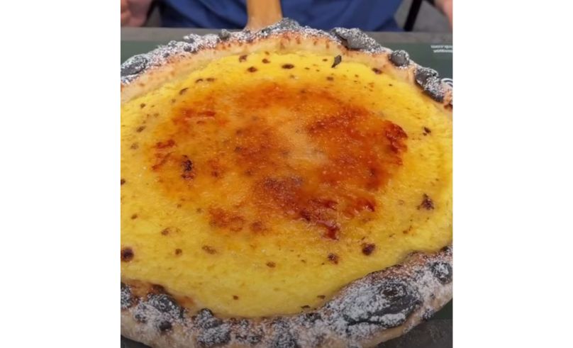This is what happens when dessert refuses to stay in dessert form. Crème brûlée pizza takes the crackly caramel drama of the classic and spreads it confidently over dough, creating something that feels wrong until it suddenly isn’t.