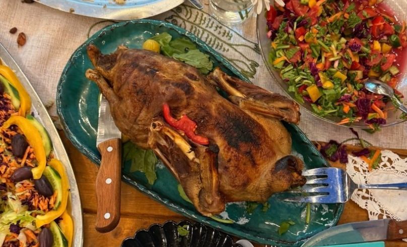 Bowls of balady salad and vegetarian salad brightened the table first, followed by duck soup, fragrant and restorative, then dishes of molokheya, roasted quail, oven-baked potatoes, stuffed duck with onions, rice rich with duck broth, potatoes sharpened with sal’ and lemon, and Teta Loula’s roukak. Platters kept moving from hand to hand, called back for second and third helpings before they had barely made a full round. Around them came the stories, each dish opening into another memory: one grandmother who always added a little extra nutmeg, another who swore by a generous shake of spicy paprika, each variation defended lovingly as the right one. Farida, one of the guests, took charge of carving the duck, while at one point beetroot juice splashed across Yasmine’s trousers and was met not with horror but a burst of laughter. And at the helm of it all sat the grandmothers watching the table with pride, their faces lit up as we ate.
