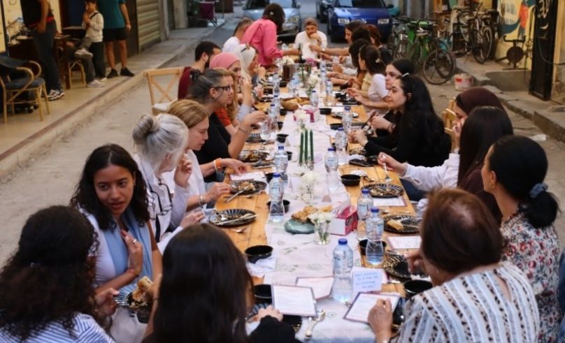 After a full day of activities where the body can’t wait to melt into a seat and your stomach grumbles calling for refuel, we found our way back to Stabene Community Centre ready for the main event: dinner. We settled around a long family-sized table setup in between the old facades of Port Said under fairy lights, turning it into our very own dining room. As we were preparing the table outside, the neighbors next door sent over a tray of Mahshi. Teta Mary’s daughter and granddaughter helped set up the table, and Zeina and Mary brought out the platters of food one by one. As more neighbors and frequent visitors of Stabene cultural centre streamed in, another table was added and the meal continued.