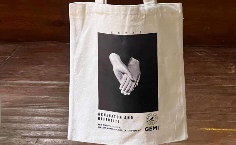 “Akhenaten and Nefertiti's hands, clasped for thousands of years and printed on an Egyptian cotton tote. And, might I suggest, perfect for a little picnic in Al Zohriya garden."