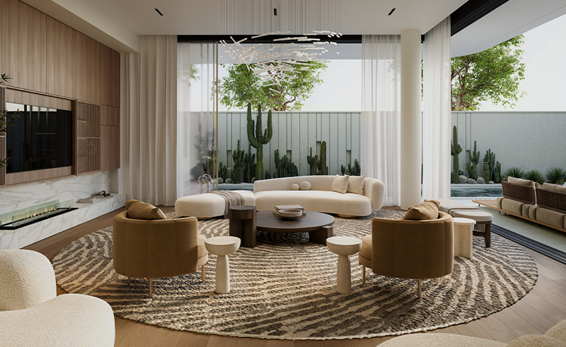 Inside, the planning is pragmatic. Floor-to-ceiling glazing frames private gardens and pools, drawing light deep into the living spaces without putting them on display. Open-plan living and dining areas are sized for everyday use, while kitchens are split between show and preparation, a familiar but practical arrangement for homes that expect to host and nurture good memories.
