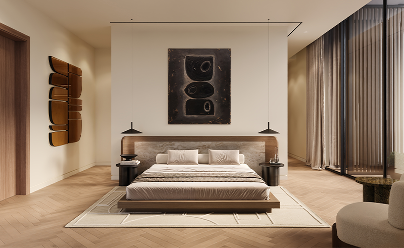 The five-bedroom layouts suggest an understanding of how families in Dubai change over time. Spaces accommodate extended households, visiting relatives, or the gradual shift from shared living to greater privacy. Storage, custom wardrobes, and circulation are not afterthoughts. Materials are simple: timber parquet, neutral surfaces, finishes chosen for durability as much as appearance.