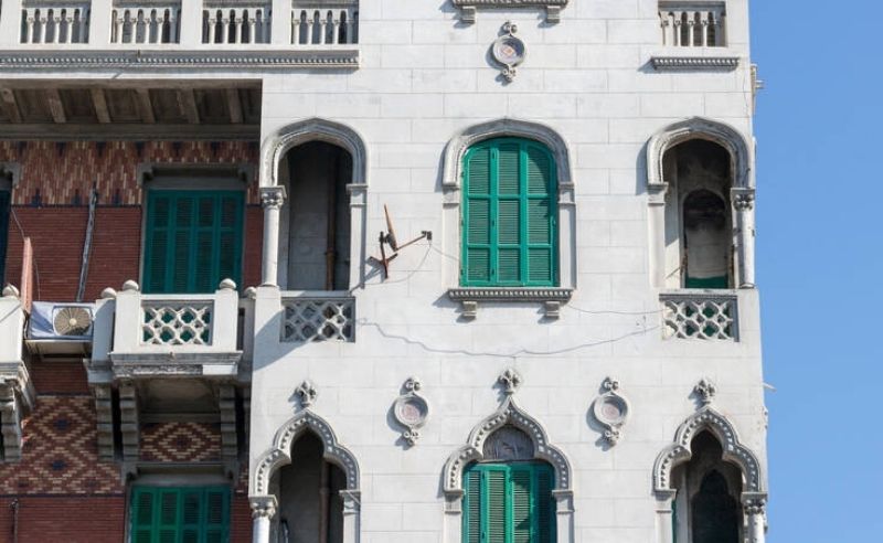 The Little Venice Building fronts the Eastern Harbour with a silhouette that reads theatrical. From a distance its pointed arches and layered bays suggest a palazzo borrowed from the Venetian lagoon; but up close, the façade admits a quieter logic composed of recessed balconies for shade, wide cornices to catch the breeze, and slender columns that control the rhythm of light and shadow across the masonry. Awarded a municipal prize for façades in 1929, the block is less an exercise in pastiche than a localized translation: Venetian forms reshaped for Alexandria’s climate and harbour life, where façades must hold up to salt, sun and constant movement.