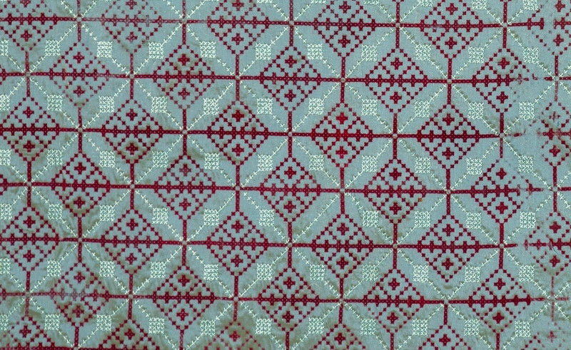Palestinian textile artist Areen Hassan draws on heritage as the thread that binds her art and identity. Her series, 'Weaving the Land Back', comprises three large-scale works that reframe traditional Palestinian motifs through a contemporary lens. By combining cross-stitch embroidery with silkscreen printing, and by allowing threads to unravel, Hassan builds textiles that are simultaneously structured and broken down. This dialogue between construction and deconstruction anchors the series. Embroidery is treated as a structural framework, tracing survival, displacement and identity.