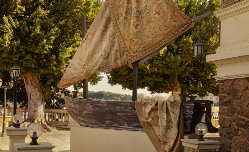 In front of it, 'Sailing Threads', designed by 'The Design Avenue' with carpets provided by Kahhal 1871, situates a felucca within the grounds. The installation immediately links visitors to the river that defines Cairo’s life, creating a sense of movement and place.