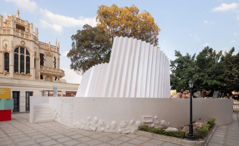 The installations created or realised in collaboration by 'The Design Avenue' unfold as a journey, guiding visitors from the palace gardens to its interiors. At the entrance, 'Pearl Re-imagined', created by 'The Design Avenue' with Qatari Diar as the client, introduces visitors to the theme of memory. Its shell-inspired pavilion layers and interplay of light echo the Nile’s historic role as a carrier of goods and culture. Furniture and textiles reinterpret traditional materials in fluid, contemporary forms, while select artworks from Tam Gallery complement the pavilion’s narrative. “With Pearl Re-imagined, we wanted to connect the history of pearl harvesting in Qatar with the memory of the Nile,” says Talaia.