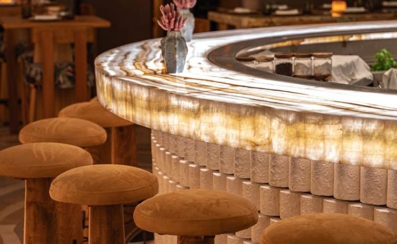 That duality defines the entire space. The exterior’s quiet solidity gives way to an interior that opens into light, texture, and tactility. Earthy plaster finishes, Egyptian stone, and hand-finished details introduce craft into a setting that could otherwise lean too far towards being polished. One of the masterpieces in the space is the signature curved marble bar that extends outward toward the terrace, bridging inside and out in a gesture that mirrors the project’s overarching theme.