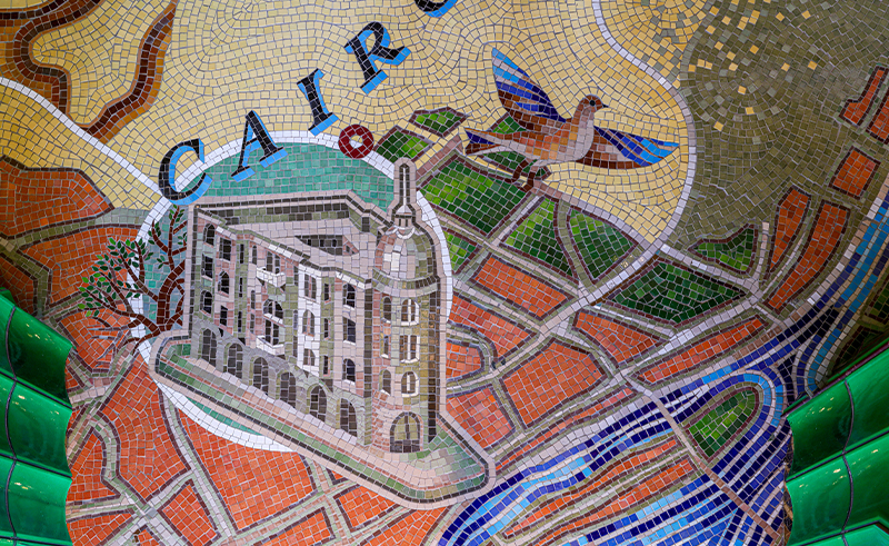 The mosaic, placed across the main floor, maps Egypt’s landmarks. Designing it required sensitivity: how to represent cultural icons without creating discomfort around the idea of stepping over sacred sites. “We went through several iterations to find the right balance,” says Hefnawy. “Each piece was simulated digitally before being placed. It’s a map, but it’s also a memory you walk on.”