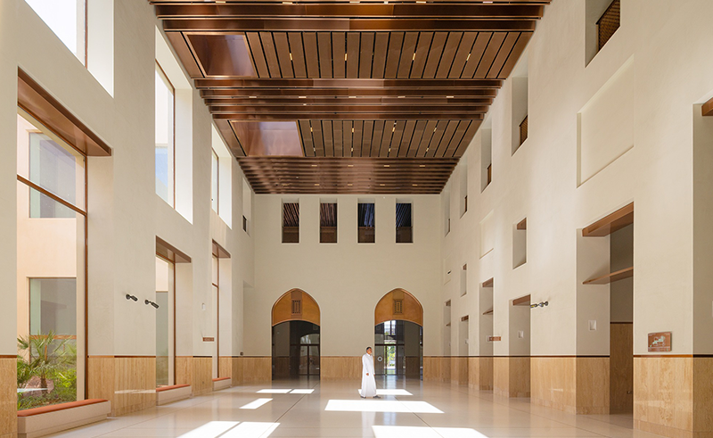 Inside, the roshan appears in copper, catching natural light to produce shifting tones as the day progresses. The material introduces warmth while remaining precise and controlled, carrying craft traditions into a contemporary context. Interior surfaces are paired with neutral stone and polished concrete, creating a calm backdrop that accentuates the copper’s reflective quality.