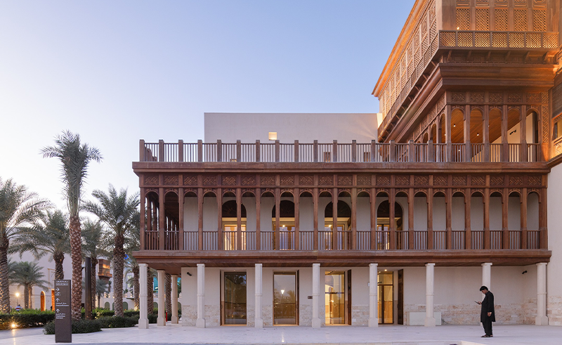 Externally, the façades balance solidity and openness through layered compositions that echo the depth and rhythm of Jeddah’s historic architecture. Handcrafted wood meets advanced fabrication techniques, creating surfaces that register shadow, scale, and proportion without pastiche. Roof terraces and overhangs provide shaded outdoor spaces, extending the public realm vertically and offering panoramic views of the lagoon and the historic city.