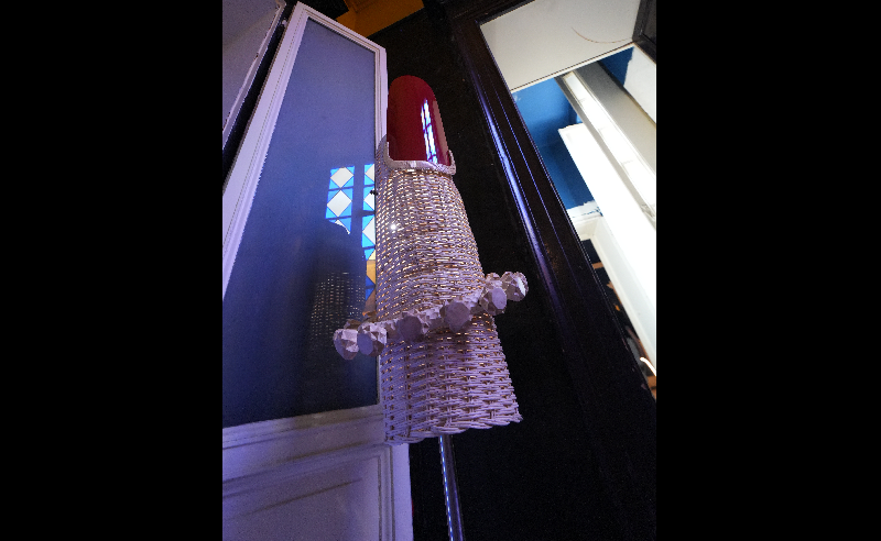 The mouth is made up of small fragments of material coming together hues of bold red and bright pink. It blows a bubble of glass holding light; an image that ‘does not whisper, but declares.’