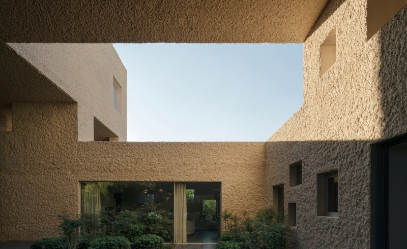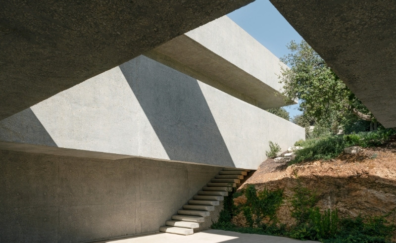 Meanwhile, a home in Dabouq negotiates a sloping oak-covered site, wrapping around a central courtyard with one wing grounded and the other suspended over the slope. The design channels natural airflow, frames views of the surrounding greenery, and creates intimate outdoor spaces sheltered from the street, with skylights and large openings bringing light into the interior, and materials and textures from stone walls to timber finishes connecting the building to its environment.