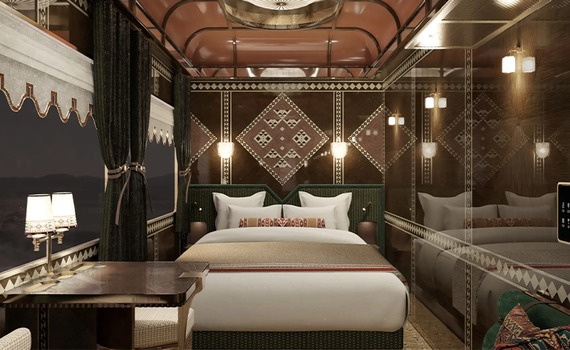 The wagon is conceived as a contemplative environment, guided by proportion, materiality, and light. Its palette draws directly from the desert, combining muted sand, clay, and oasis green with carved timber panels and reinterpreted textile patterns that introduce tradition without ornament. Murano glass lighting adds a soft, cinematic glow, revealing textures and surfaces with subtlety. From joinery to seating placement, every detail reflects a balance between comfort and spatial clarity.