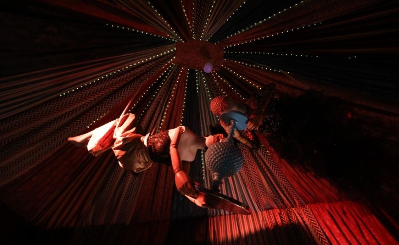 The experience begins at the carnival-style ticket booth, with clowns on tall stilts greeting visitors at the building’s gate. After riding the original vintage elevator, guests step through a narrow entrance that opens into a realm draped in colourful fabrics, transporting them into the vibrancy and wonder of the original box. The exhibition was brought to life through collaboration with her team and her sister, whose support was invaluable, creating a space that invites visitors to inhabit a world of wonder that resonates across generations.