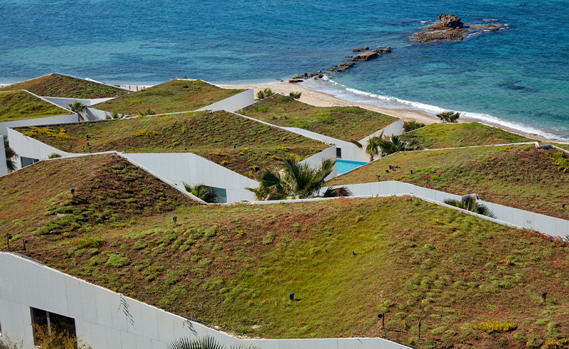 Each unit features a double-height living space opening onto a patio or roof deck, with pools integrated into the terraces to further extend the domestic space. The careful layering of volumes, shifts in height, and orientation maintain visual separation between homes while allowing them to feel connected to the wider landscape. The impact of the design lies in these cumulative choices: terraces that follow the slope, green roofs that soften the geometry, paths that frame views, and walls positioned to allow natural breezes.