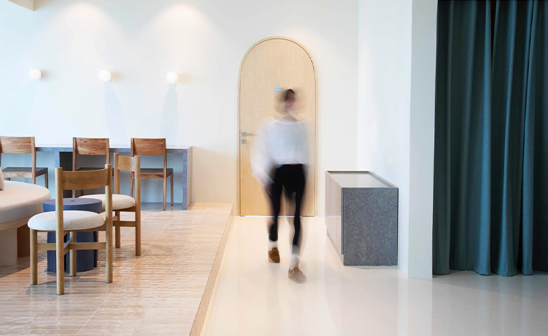 Boundaries dissolve through fabric rather than walls. Curtains define zones that can expand or contract as needed, allowing the space to shift with its users. “Walls felt overrated,” Bokr tells SceneHome. “Curtains do the job, open when you need privacy, closed when you don’t. It keeps the space breathable, flexible, and way less intimidating.” This fluidity separates yet connects two experiences, a bright, weightless studio for movement and a warm, grounded café for gathering.