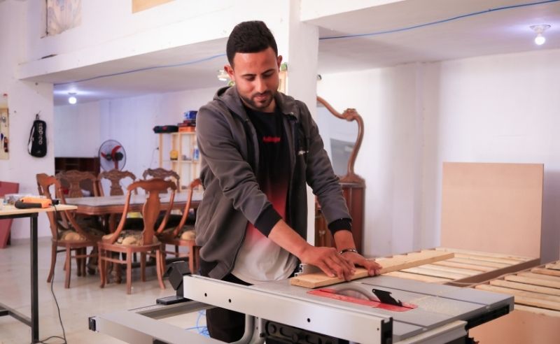 In Egypt, Bilal immediately got to work rebuilding his furniture business: Rawa’a Carpentry. SafeGrow helped him find a workshop space, provided the basic machinery, and covered his first few months of rent. Now, he is fully independent and has hired someone else, also displaced in Cairo from Palestine, to help run the enterprise.