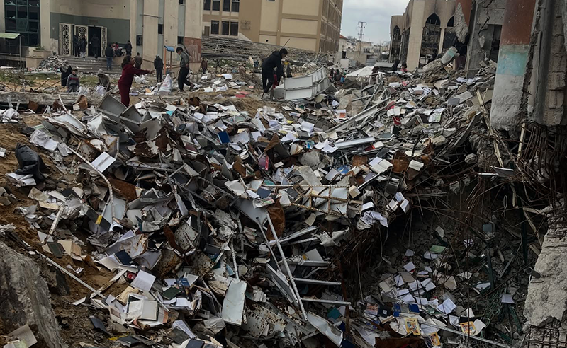 Since the genocidal war started in 2023, libraries across Gaza have been reduced to ash, along with entire archives of intellectual heritage. Over the past two years, 70% of Gaza’s archives have been lost, including the Gaza Central Archive, which held more than 150 years of historical records. More than 87 libraries have been damaged or destroyed, and all 12 universities have been reduced to rubble or rendered unusable - cutting off access to education, cultural memory, and turning books into endangered relics.