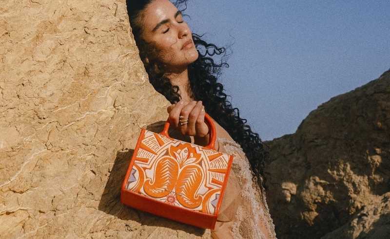 Okhtein’s Wadi Mini Tote gives Burnt Orange its most architectural moment. The jacquard surface catches light in small, shifting patterns, while the compact shape and structured handles keep everything sharp.