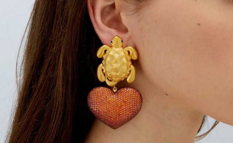 Begüm Khan’s Turtle In Love earrings turn the shade into jewellery-box opulence. Burnt orange stones sit in gilded settings that feel playful and regal at once.