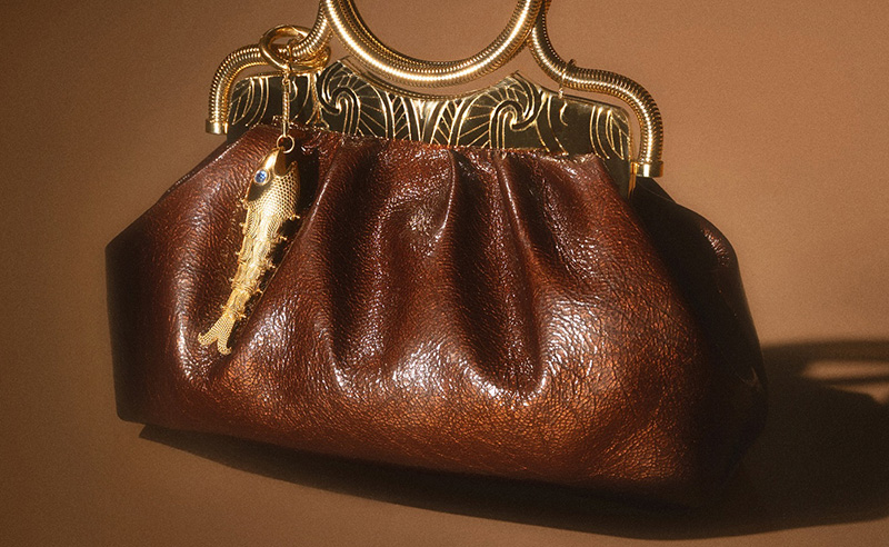 Okhtein turns Caramel Café into jewellery you can carry. The Studded Bangle Clutch wraps warm leather around a sculptural metal handle, dotted with studs that catch the light. It swings from wrist to table like a bracelet with storage, bringing just enough edge to balance all the softness in this palette.