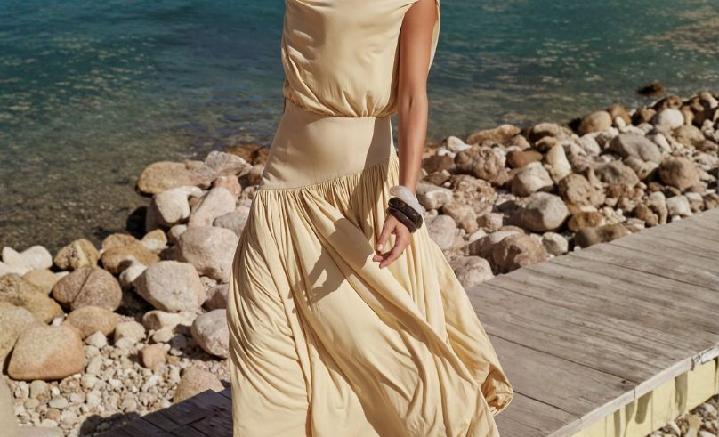 Razan Al Azzouni’s Oyster Dress gives the palette a playful, sculptural twist. Short, structured and detailed, it reads like eveningwear that doesn’t take itself too seriously. The Buttermilk tone keeps the silhouette light - perfect for weddings, rooftop dinners and every “I need something pretty but not loud” event in between.