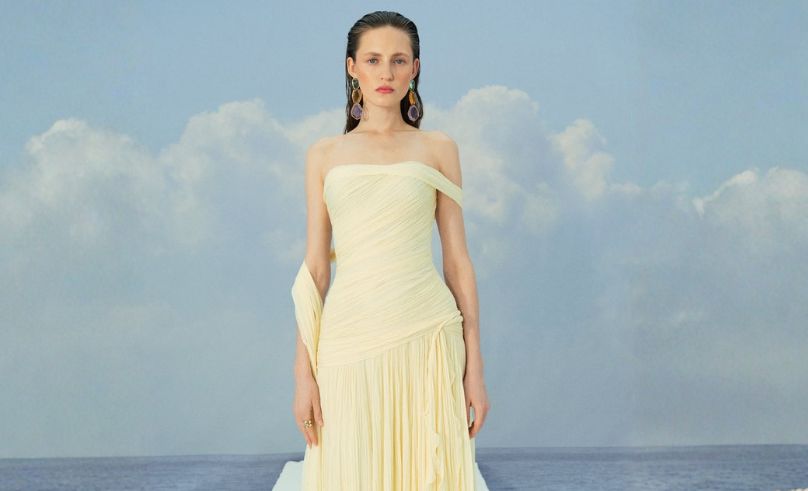 Marmar Halim takes Buttermilk straight into evening. The one-shoulder neckline, twisted detail and pleated chiffon give the gown movement that feels like poured light. It’s romantic without tipping into saccharine: the kind of dress that glows under spotlights and sunset in equal measure.