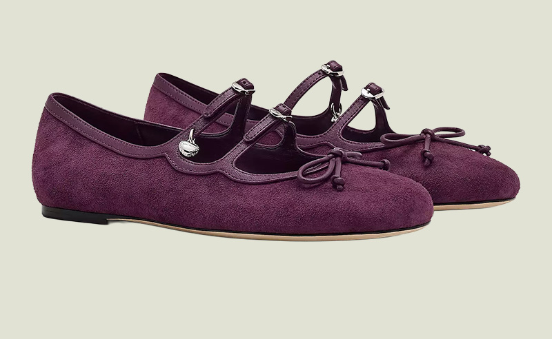 Marc Jacobs’s Suede Kiki Ballerina renders the shade in suede with buckle detailing. Akaoui Jewellery’s Amethyst Drop Earrings introduce the tone through gemstone drops. Ausetia’s Scarlet Obelisk Set applies it across a coordinated top and trouser pairing. Zankov’s Embellished Pencil Skirt contains it within a fitted silhouette. Dragon Diffusion’s Santa Croce Woven Leather Bag presents it in woven leather.