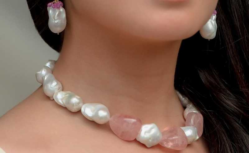Dima Jewellery’s Rose Quartz necklace gives the shade a polished finish. The smooth stone reflects light with a subtle warmth, while the gold detailing adds quiet structure. It’s a piece designed for understated elegance.