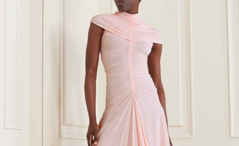 Alaïa’s ruched jersey mini dress reimagines the colour as sleek and sculptural. The close-fitting cut moves with the body, creating quiet drama that feels precise rather than loud.