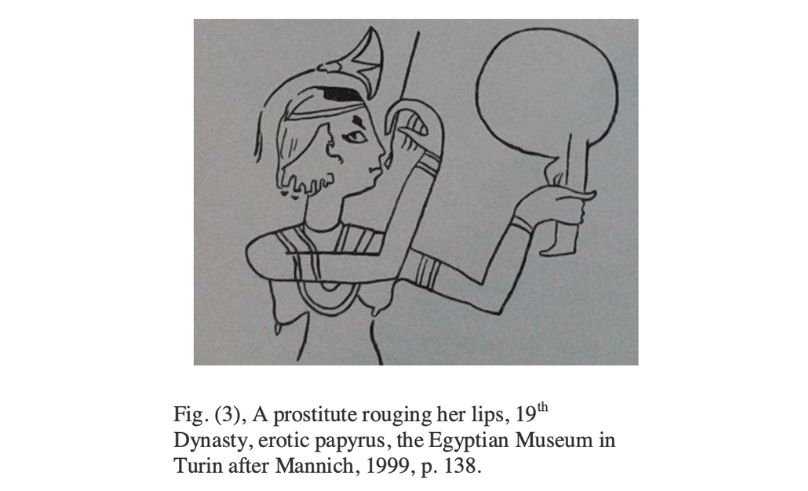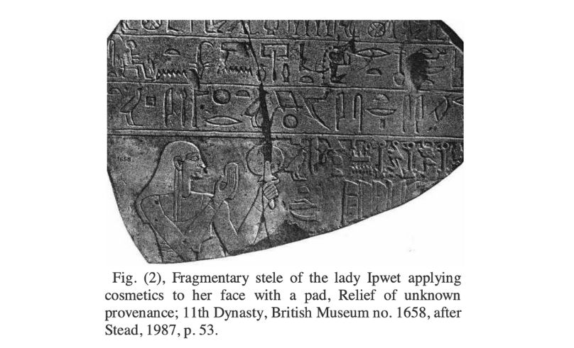 On one Middle Kingdom monument (Fig. 2), a woman named Ipwet gazes into a mirror, dabbing rouge onto her cheeks. Centuries later, in a Nineteenth Dynasty papyrus (Fig, 3) often called the “erotic papyrus,” a courtesan appears with a lotus flower tucked into her wig, painting her lips as she studies her own reflection in a metal mirror.-207ebb8b-d375-4755-945a-441705525479.jpg)
