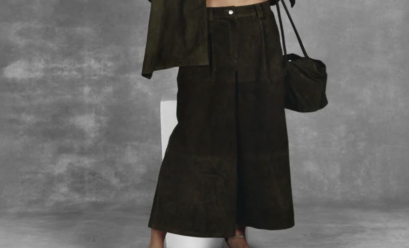 Shape and structure take center stage elsewhere. Rota Pieces streamlines stripes into a lightweight boat-neck essential, while Double A cuts olive suede into cropped, confident tailoring. Khaite’s Hilda Dress brings movement through bias-cut lambskin, and Onori refines the classic Bermuda with gold hardware and a clean monogram finish. Even the accessories lean into intention — from Amina Muaddi’s sculpted slouch boot to Zentia’s plush fold-over clutch.