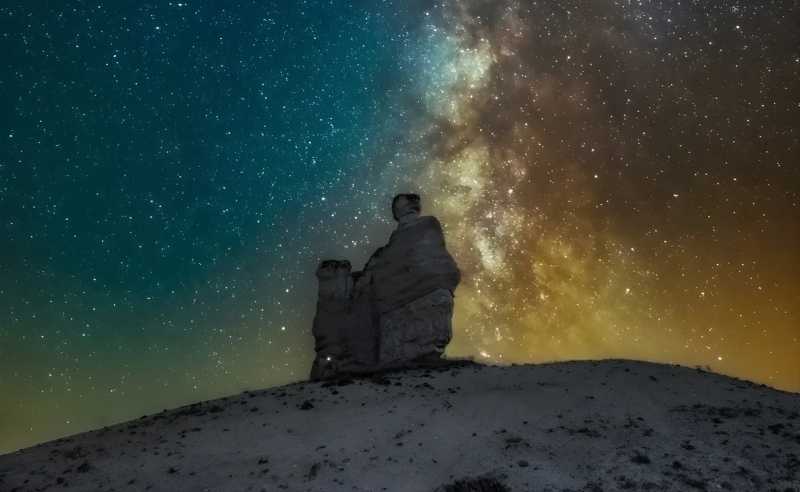 His vibrant photographs of the night sky come from drives out into "the deep and desolate steppes of Anatolia" and high-altitude, secluded peaks where “the stars speak to the earth, far from light pollution." He arrives at a location before the sun has fully set, while the light is still beginning to recede. His goal is to feel the texture of the place, the direction of the wind, the “breath of the geography." Then he sets up a tripod, determines the frame, and waits, sometimes for hours. His eyes during this time are not on the viewfinder but on the sky itself. "At that moment, my camera becomes a silent and compassionate witness, accumulating time on my behalf."