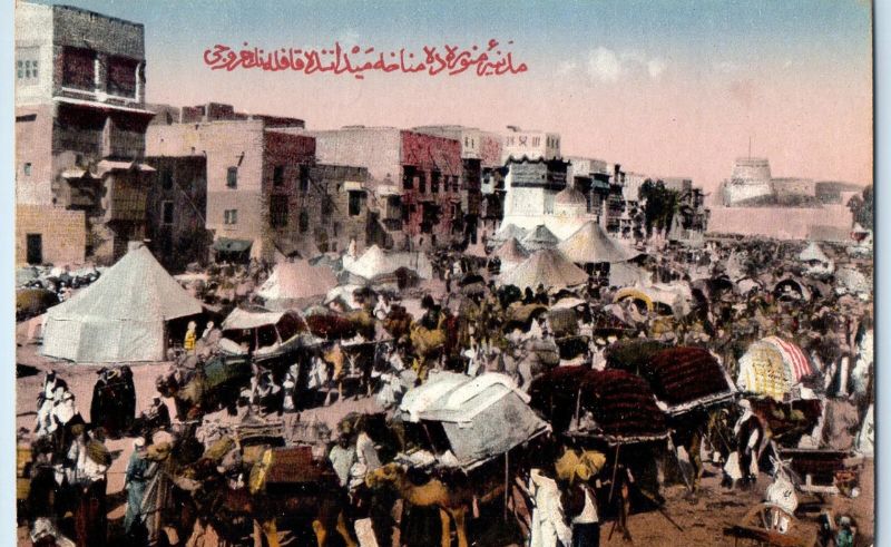 A chaotic and colourful Madinah Market scene fills the foreground, where a throng of people and camels crowd the open ground.