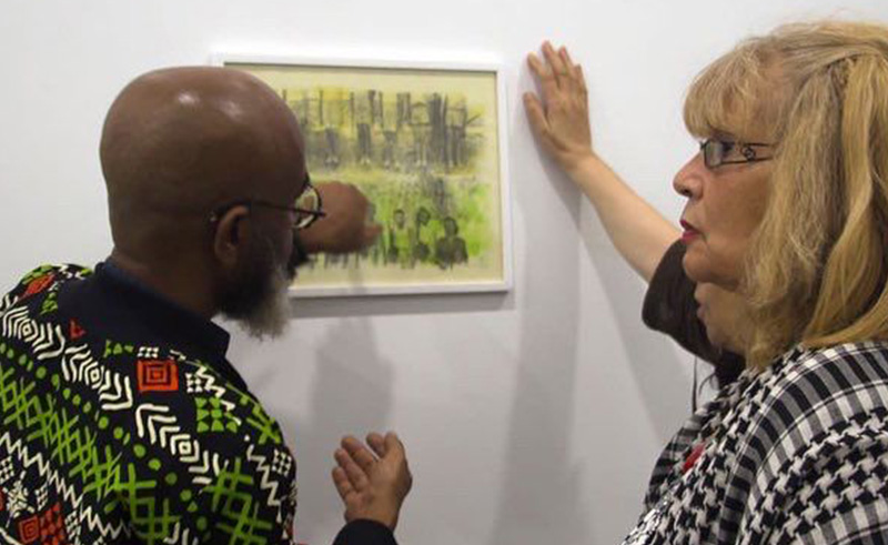 Alfadni’s works have always incorporated African imagery, folklore and historical images to bring to life unknown histories. He intersperses the icons of the idyllic rural life led by Odile with his signature references to African mythologies and histories, and the ever present tricolor of the old Sudanese flag. One of Alfadni’s ongoing projects focuses on the lives of little-known Senegalese legions which fought in the German army during the 19th century.
