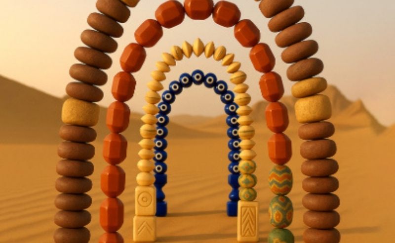 An immersive installation of five monumental arches, each echoing a distinct era from Mleiha’s past. As you walk through, the arches become a living necklace, connecting ancient artisans and traders to the present moment. The artist beautifully brings the bead—a symbol of ancient trade—back home to the desert where its story began.
