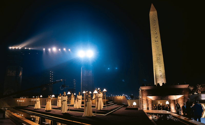 Mohamed Attia’s design for the inauguration was built on three main pillars: the pyramid and its module, the Grand Egyptian Museum as an architectural icon, and the ancient obelisk that anchors the site. He explained that these elements guided every decision. “I had to respect their visual dialogue,” he says. “Every line I drew followed theirs.”