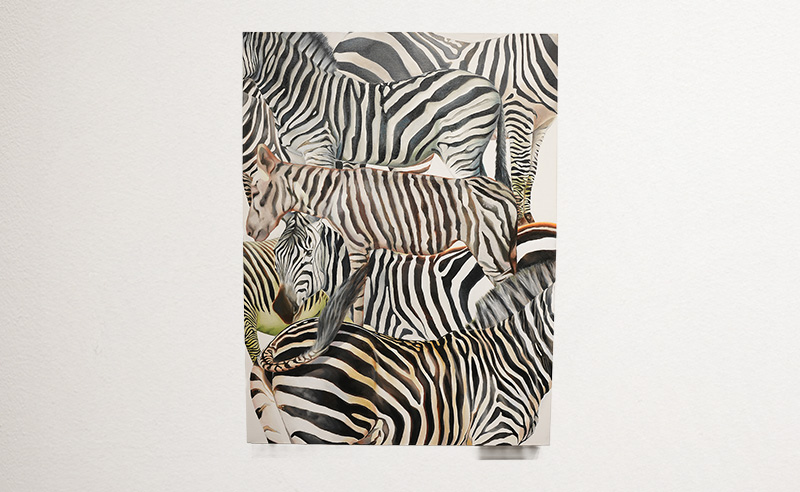 'Inferiority Complex', an oil on canvas work, deceives the eye in two ways. Placed by the curators alongside Brigitte Khouzam’s 'Stillness in Motion', a collection of four photos of cheetahs at the Zoo, Akmal’s painting of zebras appears at first to also be a photo collage. Upon inspection, however, one realises that they are not photographs at all, but the skilled work of Akmal, who has been painting with oil since she was two. Upon even closer inspection, you notice that the zebras are not all zebras. In the centre of the painting is a donkey, painted like a zebra.