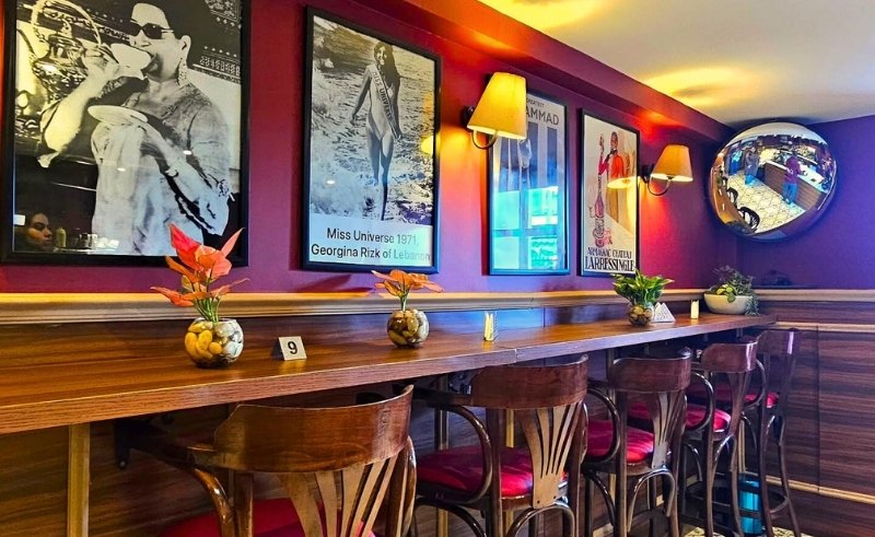 When I stepped into Eugénie, things calmed for a moment—but only just. A host of young waiters hurried back and forth between the bar and the two rooms that formed the cafe, from which I could hear but not yet see the bubbling energy of a cafe overflowing with patrons. Customers were waiting by the entrance for a table to free up, behind them framed posters of Muhammad Ali, Georgina Rizk, and Umm Kulthum—some of the many hung on Eugénie’s blood red walls. The sound of the wind outside could no longer be heard. In its place: Dalida’s ‘Paroles, Paroles’.