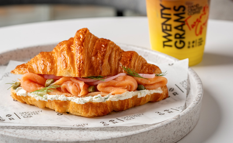 Known for their viral coconut-infused latte, 20 Grams offers a delectable culinary pairing to accompany this brew - a freshly baked, flaky croissant sliced in half, generously filled with smoked salmon, and complemented by a soft spread.