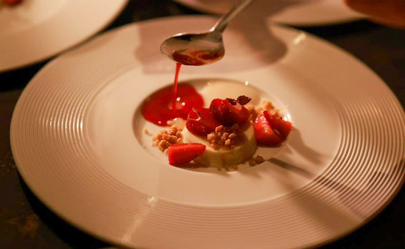 A bluefin tuna dish came first. Cut in cubes, holding its cool, it gave way on the tongue. The fat remained clean, almost understated, as ponzu moved through — citrus and salt drawing a sharper line, bringing the palate into focus. The gambari, still tender at the centre, leaned into sweetness before smoked peas left a lingering, charred trace on the plate. A soft hammour dish sat in the middle of it all, its flesh breaking apart cleanly, each flake holding its shape without collapse.By the time the quail arrived, the tables had begun to come undone, everyone crowding a single chair in the middle of the room. The skin held taut, lacquered, giving way to darker meat edged with smoke, while artichoke cut through with a slight bitterness that kept each bite in check. The wagyu — a group favourite — rounded off the savoury courses, its marbling catching the light as the fat dissolved almost instantly on the lips. Dessert closed on strawberry, reworked — its sweetness held back, layered instead over crumbled biscuits.
