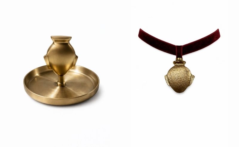 “Keep your heart light as a feather, the new collection of necklaces on a velvet ribbon and trinket trays are representative of the heart in ancient Egyptian hieroglyphs.”