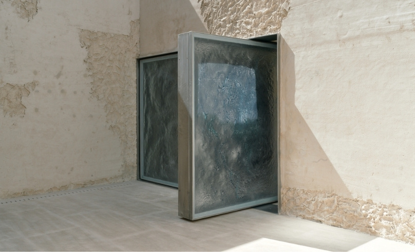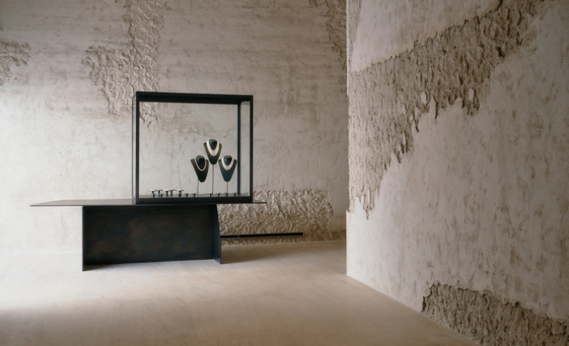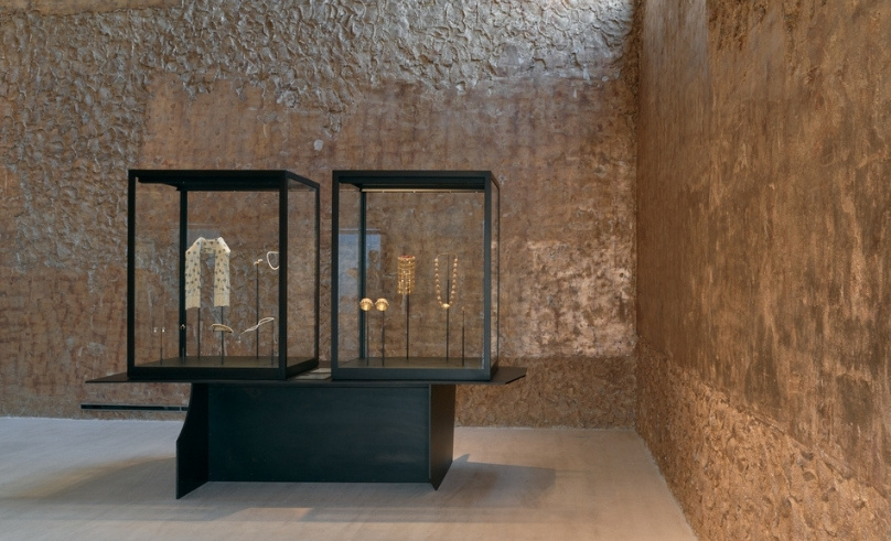 In the main exhibition hall, a seven-metre-high space, plastered surfaces are finished in silver leaf. Chosen for its mutable nature, the silver develops a soft golden patina when exposed to air and humidity, echoing the richness of historic interiors such as those of the Siyadi Majlis without replicating them. It is a gesture that links past and present, embedding change within continuity.