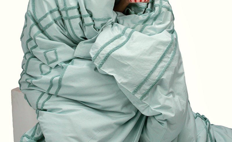 Their upbringing continues to shape the visual language of their work. Their mother’s attention to embroidery and their father’s attachment to traditional forms remain present, alongside references drawn from their childhood and daily lives. These influences appear through stitched phrases, colour choices, and compositions that carry familiarity and personal meaning.