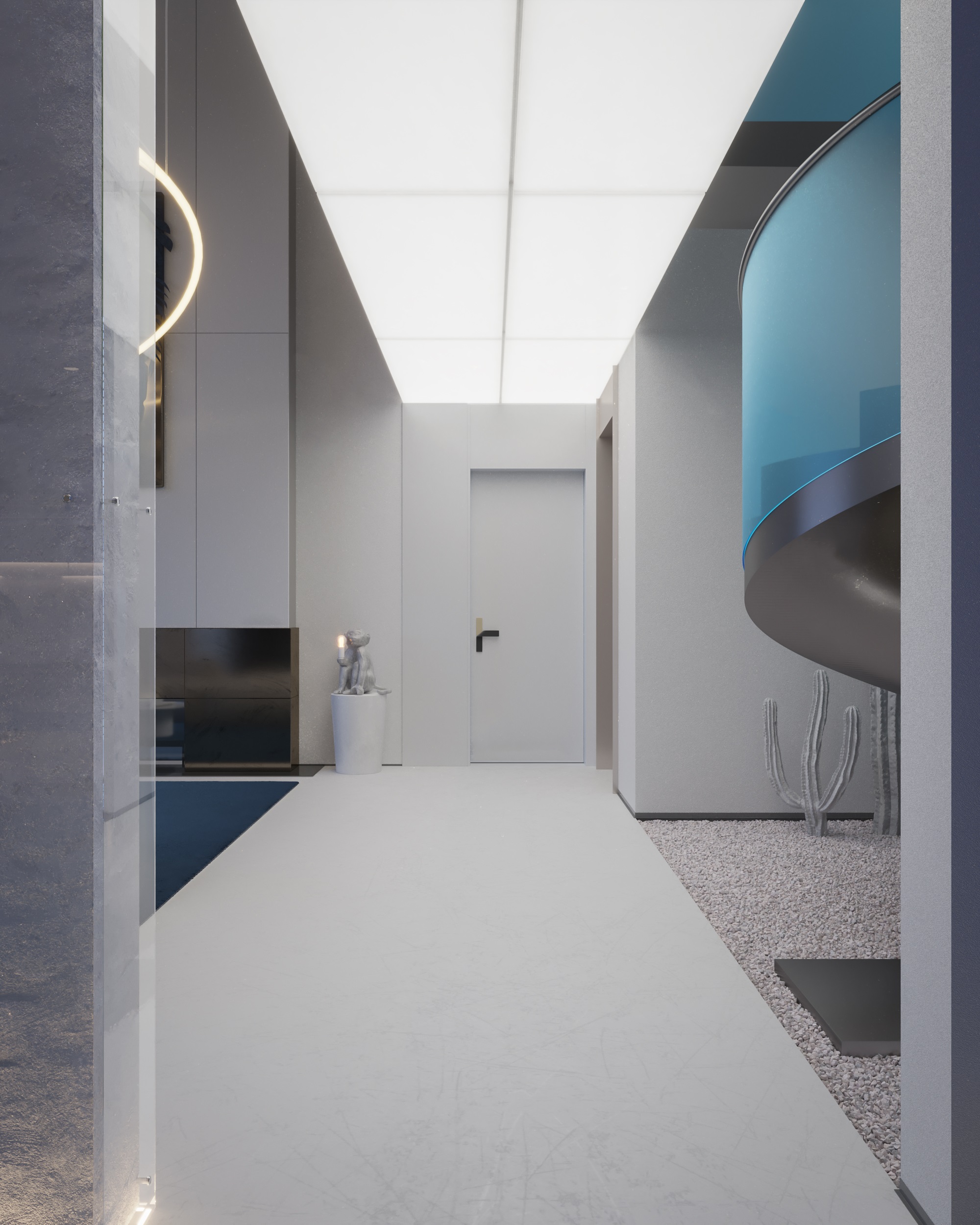 “The interior is focusing mainly on serene ambiances, and how much of an impact colour spectrums can have,” Founder Mahmoud Sherif writes in the design’s description. Having previously fixated on rather darker hues in ‘Ode to Black’, the designer drenched this conceptual loft in neutral whites with scattered dashes and hints of blue.